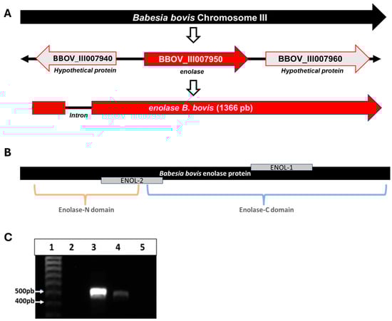 Figure 1. (A) Schematic representation of enolase gene location on B. bovis chromosome III. (B) Schematic representation of enolase protein with the two enolase domains identified by SMART and the location of peptides ENOL-1 and ENOL-2. (C) Amplicons obtained from the reverse transcription-PCR assay with specific primers for the enolase gene on 1% agarose gel stained with GelRedTM. (1) Molecular size marker, (2) negative reaction control, without DNA or cDNA, (3) B. bovis DNA, (4) cDNA from B. bovis, (5) RT negative control, RNA treated with DNase but without retro transcriptase.