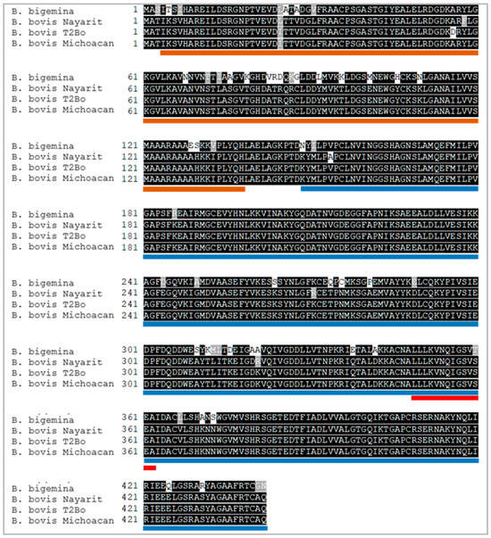 Figure 2. Multiple alignment of the B. bovis enolase predicted amino acid sequence. The sequences of Nayarit and Michoacan isolates were compared with the sequence obtained from the T2Bo sequence (AAXT00000000.2) and B. bigemina enolase (QEG79394.1). Orange and blue lines represent the Enolase-N and Enolase-C domains predicted by SMART. The red line represents the signature pattern of enolase identified by PROSITE.