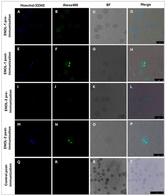 Figure 3. Enolase is expressed in B. bovis merozoites. IEP were incubated with sera from a rabbit immunized with peptide ENOL-1 (pre-immunization panels (AD) and post-immunization panels (EH)) and peptide ENOL-2 (pre-immunization panels (IL) and post-immunization panels (MP)). No signal was observed when merozoites were incubated with the post-immunization serum from a rabbit immunized with adjuvant (panels (QT)). Panels (A,E,I,M,Q) show the Hoechst 33342-stained nuclei. Panels (B,F,J,N,R) show the filter with Alexa Fluor 488. Panels (C,G,K,O,S), show the bright field images and panels (D,H,L,P,T), show the merged images. 100×. The black line indicates the micrometer ruler.