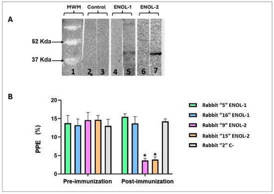 Figure 4. (A) The B. bovis enolase protein is recognized by anti-enolase antibodies by WB in B. bovis-infected red blood cells. Line 1: molecular weight marker; line 2: adjuvant control pre-immunization serum; line 3: adjuvant control post-immunization serum; line 4: ENOL-1 pre-immunization serum; line 5: ENOL-1 post-immunization serum; line 6: ENOL-2 pre-immunization serum; line 7: ENOL-2 post-immunization serum. (B) Neutralization Assay. The values on the Y–axis are shown as percentages of parasitized erythrocytes (PPE). On X–axis the results obtained from the evaluation of the inhibition generated by different antisera are shown. * = significant difference between the pre- and post-immunization serum samples (p < 0.05). Only sera from rabbits immunized with ENOL-2 showed significant statistical difference. The original Western blot figures can be found in Supplementary File S1.