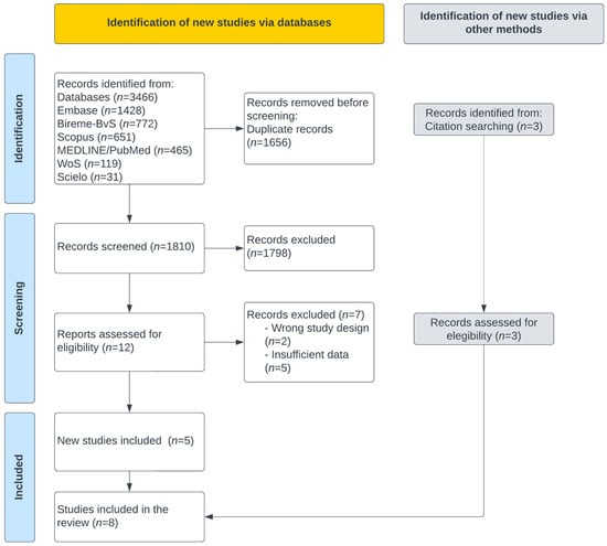 A total of 3466 items were extracted from the sources of information (Figure 1); 1656 items were eliminated due to duplicates, and 1810 articles were evaluated by title and abstract. Twelve articles were analyzed by full text, discarding seven manuscripts. Five studies were included from the sources of information, and three came from the manual search, with eight articles included.