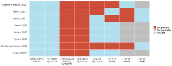 - SARS-CoV-2 infection: All eight articles, as a requirement, include a history of acute COVID-19 infection; 37.5% (3) of the studies describe the need for a positive laboratory test for SARS-CoV-2, and 12.5% (1) include suspicion and confirmation of acute infection;