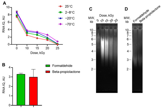 We studied the integrity and quality of the isolated viral RNA by fluorescently labeling the large and small RNAs. A number between 1 and 10 represents the percentage of large RNA molecules in the sample. We observed a gradual decrease in IQ values in samples irradiated with accelerated electron doses (Figure 3A). The IQ of the non-irradiated control samples was 7.4–8.8 AU, indicating a high degree of RNA integrity. This value dramatically decreased to 0–0.8 AU in 25 kGy irradiated samples, indicating complete RNA degradation. In general, the IQ values of samples irradiated at −20 °C or −70 °C were higher than those of samples irradiated at 25 °C or 2–8 °C, indicating that the viral genome is more stable in frozen samples when exposed to electron beam irradiation. The IQ values of samples inactivated by formaldehyde or beta-propiolactone did not exceed 4 AU (Figure 3B). Agarose gel electrophoresis of total RNA isolated from irradiated viral samples (Figure 3C) confirmed that the genome was degraded by irradiation. The main RNA bend from the control, non-irradiated sample was located at the top of the gel, within the 7 kb molecular weight marker area. After irradiation with 10 kGy, the size of the main bend decreased to 5 kb. Subsequent irradiation with increased doses of radiation resulted in the complete loss of full-size RNA. The RNA bends from samples inactivated with formaldehyde or beta-propiolactone are located near the 3 kb molecular weight marker (Figure 3D).