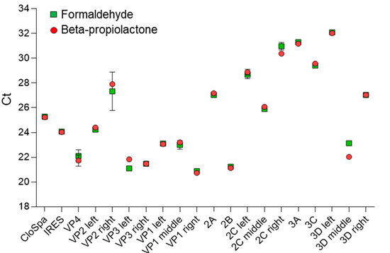 We determined Ct for each poliovirus genome segment after inactivation with the commonly used chemical reagents formaldehyde or beta-propiolactone (Figure 5). Very good consistency between Ct values was observed for samples treated with each of these reagents. Again, the left 3D segment showed the highest Ct values of 32.10 ± 0.10 for formaldehyde and 32.03 ± 0.15 for beta-propiolactone-treated samples, demonstrating the high sensitivity of this segment to inactivating chemicals. The VP1 right segment showed the lowest Ct values of 20.87 ± 0.06 for formaldehyde and 20.87 ± 0.15 for beta-propiolactone-treated samples. Low Ct values again indicate the highest resistance of this segment to degradation.