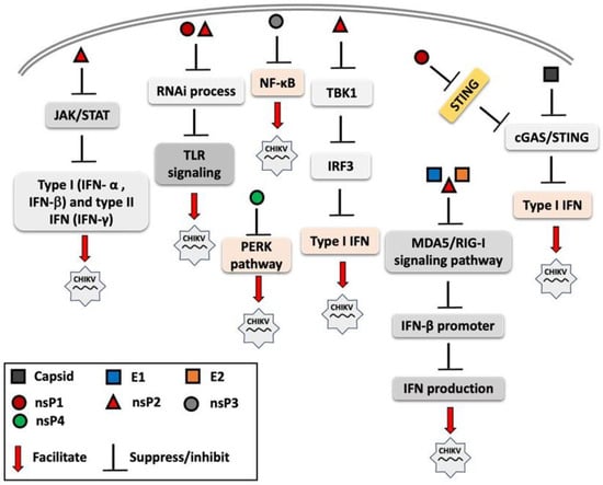 Hosts possess defense mechanisms that act to prevent the establishment of infection; therefore, successful viral infection requires the inhibition or evasion of early host defenses mediated by the innate immune system. The Janus kinase-signal transducer and activator of transcription (JAK-STAT) signaling pathway is a key mediator of IFN signaling, and interactions between the JAK-STAT cascade and antiviral IFNs are critical to the host’s immune response against viral infection [78]. In a murine model, Geng et al. demonstrated that STING deficiency results in elevated viremia during the acute phase of CHIKV infection despite a normal-type I IFN response. In addition, STING-deficient mice exhibited exacerbated arthritis pathology, characterized by increased foot swelling, joint damage, and dysregulated chemokine expression, highlighting STING’s role in controlling viral replication and modulating inflammatory responses [79]. CHIKV capsid-mediated inhibition of cytosolic DNA sensing pathways like that of cyclic GMP-AMP synthase (cGAS) induction has been shown to reduce the antiviral efficacy of the cGAS-stimulator of interferon genes (STING) pathway [80]. CHIKV nsP1 can interact with STING, significantly inhibiting the IFN-β promotor activation induced by cGAS-STING [80]. CHIKV nsP1 catalyzes the capping of viral RNA to mimic host mRNA, thereby evading detection by innate immune sensors such as RIG-I and MDA5 [81,82]. Consequently, nsP1 may serve as a potential target for inhibiting CHIKV infection [83].