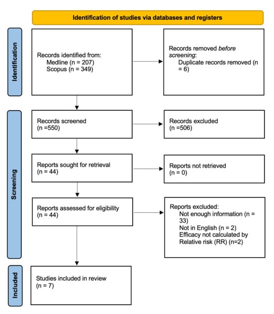 The search identified a total of 551 records after removing duplicates. The full-text versions of 44 records were screened for eligibility, 37 of which were excluded. A total of seven papers were included in the study [24,25,26,27,28,29,30]. The selection process is detailed in the PRISMA flowchart (see Figure 1).