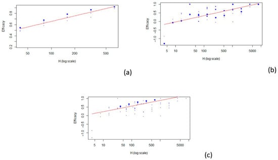 Five articles concern the relationship between TIV (a) HAI titers and efficacy [24,27,28,29,30], two articles concern the relationship between QIV (b) HAI titers and efficacy [25,26], and three articles concern the relationship between LAIV (c) HAI titers and efficacy [26,28,30]. For the 1:40 titer level, the estimated VE was 0.506 for TIV (r2 = 0.312), 0.569 for QIV (r2 = 0.878), and 0.048 for LAIV (r2 = 0.556). The results described are summarized in Table 4, and estimates for other HAI titer levels are described in Table 4.
