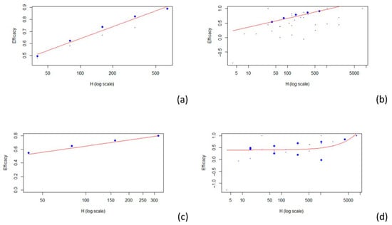 Scatterplots of vaccine efficacy and HAI titers: (a) A (H1N1); (b) A (H3N2); (c) B; (d) unspecified strain. The red line represents the fitted model.