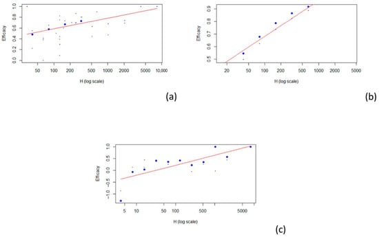 Scatterplots of vaccine efficacy and HAI titers: (a) children; (b) adults; (c) all. The red line represents the fitted model.