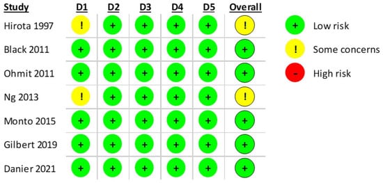 RoB2.0 assessment of the included RCT studies with 5 domains. (D1: Randomization process, D2: Deviations from the intended interventions, D3: Missing outcome data; D4: Measurement of the outcome, D5: Selection of the reported result) [24,25,26,27,28,29,30].