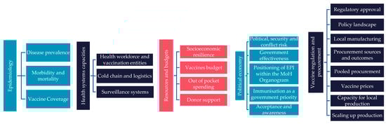 Data were systematically extracted using a bespoke data extraction tool to assess the introduction of HPV, PCV, and RV vaccines in seven MICs. Based on the extraction tool, and the categories of information arising, a vaccine readiness framework (VRF) was developed to assess vaccine preparedness across five domains: epidemiology, health system capacities, financial resources, political economy, and local manufacturing capabilities (Figure 1). The vaccine readiness framework was further refined based on insights from two rounds of expert consultations to capture the following supplementary domains: socio-political context, immunisation expenditure, vaccine manufacturing capabilities, and political and economic situation.