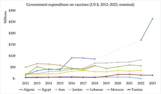 - World Health Organization. Immunization Expenditure [Internet]. Available online: https://immunizationdata.who.int/global/wiise-detail-page/immunization-expenditure?ISO_3_CODE=TUN+DZA+MAR+LBN+EGY+JOR+IRN&YEAR= (accessed on 26 November 2024).