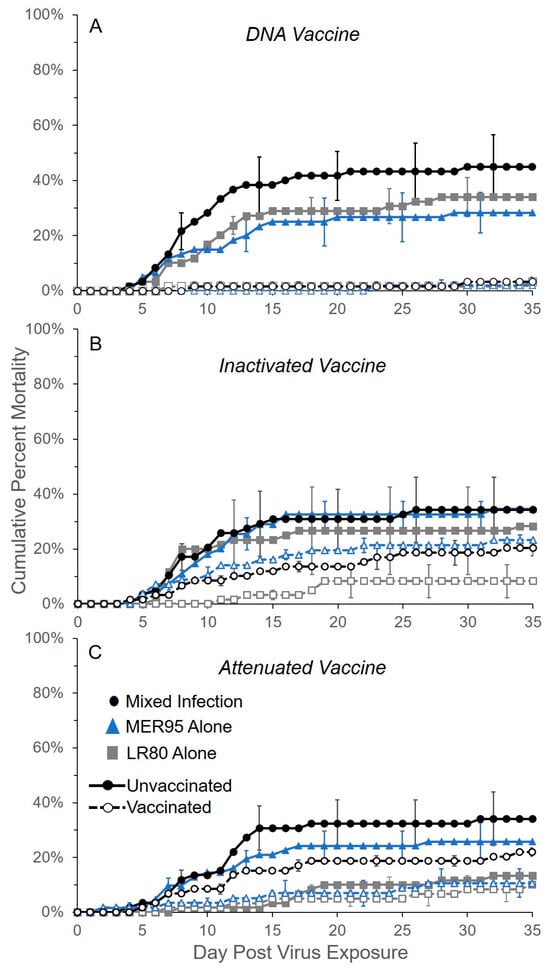 Effect of three vaccine regimens on the survival of fish infected with two IHNV genotypes in single and co-infection. Lines represent cumulative percent mortality (±1 mean standard error) averaged across triplicate groups of 20 fish exposed to IHNV genotype MER95 alone (blue triangle), LR80 alone (gray square), or a mixed infection of the two genotypes at a 1:1 ratio (black circles). Dashed lines (and open symbols) represent fish vaccinated with DNA (A), inactivated (B), or attenuated (C) vaccine regimens, and the solid lines (and closed symbols) represent corresponding unvaccinated control treatments. Legend in panel (C) applies to all panels. No fish mortality was observed in any of the mock no virus exposure control groups (21 tanks and 420 fish total across all treatments), with the exception of 1 fish in the DNA unvaccinated treatment, which was found dead on day 34 of the experiment (data not shown). Data is from the disease protection assay experiment (see Methods). SE bars are staggered between lines for readability.