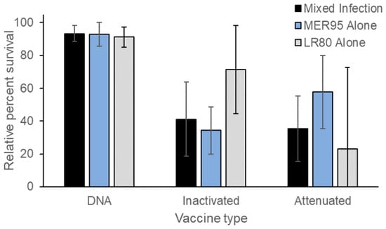 The kinetics of fish mortality through time caused by single infections of IHNV genotypes LR80 and MER95 were compared to those in co-infection, in the presence and absence of vaccination. In general, mortality began around day 5 and plateaued around day 15, in all treatments (Figure 1). No mortality was observed in any of the no virus exposure control groups (21 tanks and 420 fish total), with the exception of one fish on day 34 in the DNA unvaccinated treatment (data not shown). As such, the no virus exposure control treatment (mock virus exposure) was not considered in further analyses. Instead, the analysis focused on vaccine reductions in mortality in vaccinated compared to unvaccinated treatments, after virus exposure. Vaccination significantly lowered the hazard of mortality for all three vaccine regimen types, regardless of virus treatment (vaccine main effect; DNA: Z1,359 = −5.64, p < 0.001; inactivated: Z1,358 = −2.24, p = 0.025; attenuated: Z1,356 = −2.50, p = 0.012; Table S2). Although not directly compared, the three vaccine regimens qualitatively differed in their ability to reduce disease caused by IHNV (Figure 1). The log-hazard of death due to vaccination changed by the greatest amount for the DNA vaccination regimen compared to the attenuated and inactivated vaccination regimens (log-hazard ratio of death vaccinated/unvaccinated ± SE; DNA vaccine: −2.6 ± 0.44 < inactivated vaccine: −0.73 ± 0.33 < attenuated vaccine: −0.65 ± 0.26; Table S2). This suggests the DNA vaccine regimen provided better disease protection than the other vaccine regimens, which was reflected in the relative percent survival (RPS) values for each vaccine (Figure 2). Furthermore, RPS values indicated that protection was more uniform across virus treatments for the DNA vaccine compared to the other vaccine types. In general, the hazard of fish mortality was not significantly different between the two viral genotypes or between single and mixed infections (p > 0.05, Table S2). The only exception was for the attenuated vaccine and unvaccinated regimens, where fish infected with LR80 alone had a lower hazard of mortality than mixed-infection fish, regardless of vaccination status (virus main effect; attenuated vaccine: Z1,356 = −3.04, p = 0.002; Table S2). This was partly due to a slightly reduced level of cumulative mortality in the LR80 attenuated unvaccinated group (10% mortality) compared to the other unvaccinated controls (30–35% mortality), although this was not statistically assessed (Figure 1). In summary, all vaccine regimens increased fish survival after exposure to IHNV, with the DNA vaccine regimen being the most effective and attenuated being the least effective.