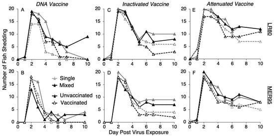 To quantify how well the three vaccines protected against IHNV shedding, a second experiment was run. A different group of the same lot of fish was vaccinated three weeks after the start of the disease protection experiment. The fish were then exposed to the virus, and water samples from tanks housing individual fish were collected as previously described [47,59,60]. Briefly, vaccinated and unvaccinated fish were exposed to single or mixed infections of virus isolates LR80 and MER95, after vaccination, as for the disease protection assays. After the 1-h static exposure to the virus, the fish were transferred to a new tank and held for 1 h in flowing water (1500 mL·min−1), previously demonstrated to remove all residual exposure virus [47]. Afterwards, each individual fish was randomly separated into a 0.8 L tank in a tower rack system (Aquaneering). This allowed for tracking of shedding kinetics at an individual fish level. The virus treatments contained 20 replicate fish, and a mock control group of 5 fish exposed to MEM-10 was included for each vaccine treatment (Table S1). The initial immersion time of the naïve fish with the virus was day 0 in this experiment.
