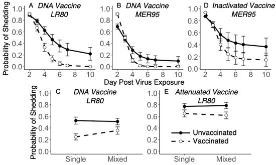 Probability of fish shedding interaction plots. Points show mean fitted probability of fish shedding IHNV per treatment ± 95% confidence interval (CI) from best-fit models for day*vaccine interaction (top panels (A,B,D)) and vaccine*infection type interaction (bottom panels (C,E)). In all panels, solid lines represent unvaccinated controls and dotted lines represent vaccinated treatments. For panels (C,E), the probabilities of shedding the target genotype in single (left) and mixed (right) infections are shown. Vaccine regimen and genotype of the model are given at the top of each panel (panels (A,C)—genotype LR80 in DNA vaccination treatments; panel (B)—genotype MER95 in DNA vaccination treatments; panel (D)—genotype MER95 in inactivated vaccine treatments; and panel (E)—genotype LR80 in attenuated vaccine treatments). Lines demonstrate trends but do not imply that data was collected between points. Points where CI bars do not overlap are considered significantly different.