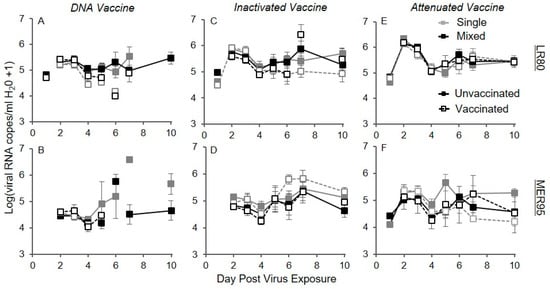 The impact of the three vaccine types on cumulative virus shedding over 10 days was evaluated across all fish (Figure 7), which is akin to herd- or population-level shedding. Vaccination with the DNA and attenuated vaccine regimens significantly reduced total viral shedding for genotype LR80 (Figure 7A,E; vaccine main effect; LR80 DNA: F1,78 = 7.16, p = 0.009; LR80 attenuated: F1,78 = 4.31, p = 0.04; Table S5A,C), but not genotype MER95 (Figure 7B,F; null model best fit both vaccines, Table S5A,C). The inactivated vaccine regimen did not reduce cumulative virus shed for either IHNV genotype, despite a suggestive trend for MER95 (Figure 7C,D; LR80: null model best fit; MER95: F1,76 = 2.6, p = 0.055, Table S5B). Total shedding was not significantly different between co-infection compared to single infection, for any viral genotype, regardless of vaccination status, despite suggestive trends for some treatments (Figure 7 and Table S5). In general, total shedding of MER95 was lower than LR80, but this was not analyzed directly (Figure 7). Qualitatively, the DNA vaccine reduced cumulative shedding over the course of the infection by the most, with reductions by the inactivated and attenuated vaccines being minimal.