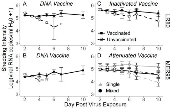 Shedding intensity interaction plots. Points show fitted mean treatment values of shedding intensity (log10(viral RNA copies/mL H2O +1) ± 95% confidence interval (CI) for interaction between day post-virus exposure (X-axis) and vaccine type (lines), from best-fit models. For all panels, unvaccinated fish are shown by a solid line and symbols, and vaccinated fish by a dashed line and open symbols. Top panels (A,C) show genotype LR80, and bottom panels (B,D) show genotype MER95. The vaccine regimen is given at the top of each panel. For panel (D), single infections are shown by gray triangles and mixed infections by black circles, due to the 3-way interaction between day*virus*vaccine. For all other panels, infection type was not significant in the model, and single and mixed infections are combined in the fitted mean values. Lines demonstrate trends but do not imply that data was collected between points. Where points are missing, no fish were shedding in the raw data, so predicted values for shedding intensity were not generated. Points where CI bars do not overlap are considered significantly different.