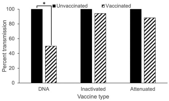 Transmission success in cohabitation assays. Bars show the percent of unvaccinated (solid) or vaccinated (striped) recipient tanks containing fish that became infected and shed IHNV after being placed in cohabitation with infected donor fish. N = 18 groups of 3 fish in all cases except attenuated and inactivated vaccine treatments, where N = 17. All donor fish tanks were positive for viral shedding (data not shown). Whiskers with (*) show statistical differences at p < 0.05 (see text).