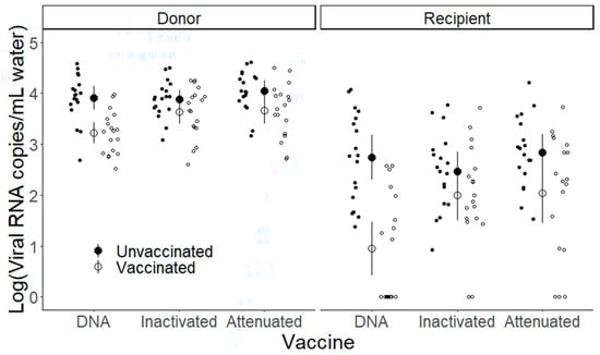 Viral shedding quantity of donor and recipient fish in cohabitation transmission assays. Small symbols show viral shedding quantity (Log10(viral RNA copies/mL H2O +1]) of individual tanks containing 3 unvaccinated (open symbols) or vaccinated (solid symbols) fish for each vaccine regimen (x-axis). The donor fish are shown in the left panel, and the recipient fish are shown in the right. Large symbols show the mean (±95% CI) for each treatment group.