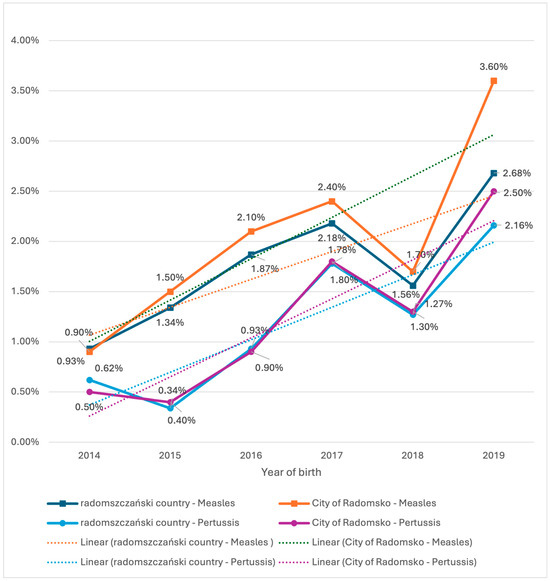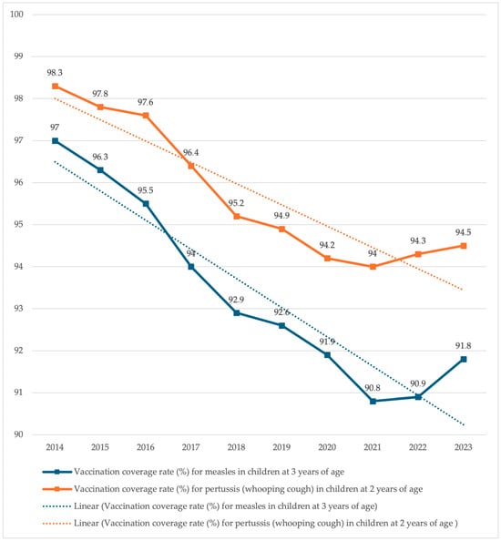 Analysis of measles and pertussis vaccination coverage data from 2014 to 2023 revealed a pronounced downward trajectory. In the initial observation period, vaccination coverage remained high, exceeding 95% for both diseases (recommended in the event of a population threat [10,11]). However, subsequent years exhibited a systematic reduction in the proportion of vaccinated children, potentially compromising epidemiological stability at national and regional levels. This declining trend is visually represented in Figure 1.