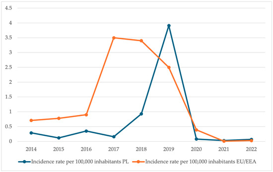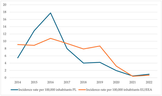 Complications of pertussis include pneumonia, atelectasis, pneumothorax, seizures, central nervous system (CNS) hemorrhages, and hypoxic encephalopathy. The group most at risk for pertussis complications are young children and infants under 6 months of age [23]. From 2014 to 2022, pertussis incidence in Poland fluctuated, peaking in 2016 at 17.77 cases per 100,000 population. This significantly exceeded the average incidence for EU/EEA countries (European Union/European Economic Area) (10.8 cases per 100,000 population) (Figure 2).