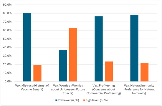 The study also utilized the Vaccine Attitudes Examination Scale (VAX) as a psychometric tool for identifying the level of acceptance, reluctance, or skepticism towards vaccinations in the population [41,42]. The questionnaire consisted of 12 statements to which respondents expressed their position on a Likert scale (from 1 “strongly disagree” to 6 “strongly agree”). The scale comprises four main subscales, each measuring a different aspect of reluctance or skepticism towards vaccinations: