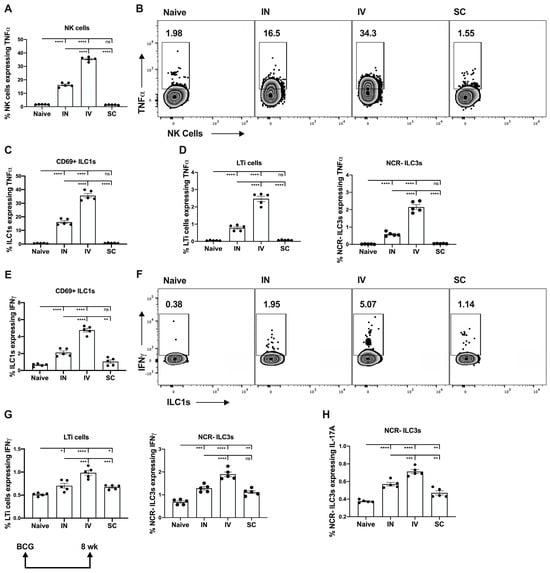 Intravenous delivery of BCG resulted in a marked increase in TNFα expression by pulmonary natural killer (NK) cells (Figure 1A,B), CD69+ ILC1 (Figure 1C) and two group 3 ILC subpopulations, NCR-ILC3 and LTi cells (Figure 1D), compared to IN delivery, even at 8 wk post-immunization. There was no apparent TNFα expression by these ILC subsets after BCG was given SC. IFNγ expression by pulmonary CD69+ ILC1 (Figure 1E,F) and ILC3 (Figure 1G) was also significantly greater in the IV vaccine group, although there was no evidence for IFNγ expression in the CD49+ NK cell population at this timepoint). Intravenous BCG delivery also generated sustained expression of pulmonary NCR-ILC3 producing IL-17A, to a greater extent than IN or SC delivery (Figure 1H).