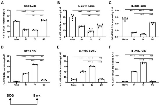 Mucosal ILC2 responses are sustained following BCG immunization via different routes. Mice were immunized and lung cells harvested as described in Figure 1 and were stained to identify ILC2 cells. Expression of IL-5 (A–C) and IL-13 (D–F) expression by tissue resident ST2+ ILC2 (A,D), migratory ST2-IL-25R+ ILC2 (B,E) and other innate lymphoid cells expressing Th2 cytokines ST2-IL-25R- cells (C,F), were determined by ICS and are shown as a percentage of parent cell populations. Each solid circle on bar graphs is a data point representative of a single mouse within each group. Data are shown as mean values ± SEM. The statistical significance of differences in cytokine expression for different BCG immunization routes were determined using one-way ANOVA with Tukey’s correction for multiple comparisons and are shown as * p < 0.05; ** p < 0.01; *** p < 0.001; **** p < 0.0001, ns, not significant.