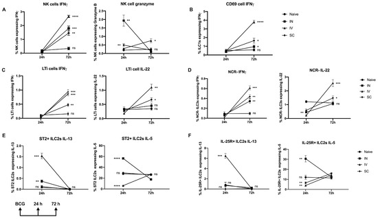 Mucosal ILC responses at early timepoints following BCG immunization via different routes. Mice were immunized and lung cells harvested, as described in Figure 1, at 24 h or 72 h later. Cells were stained to characterize cytokine expressing mucosal ILC, as described in Materials and Methods. Cytokine expression by (A) NK cells, (B) CD69+ ILC1 (C) LTi cells, (D) NCR-ILC3, (E) ST2+ ILC2, and (F) ST2-IL-25R+ ILC2, was evaluated by ICS at both timepoints. The statistical significance of differences between IV immunization and other routes at 72 h post immunization was determined using a paired Student’s t-test and are shown as * p < 0.05; ** p < 0.01; *** p < 0.001; **** p < 0.0001, ns, not significant.