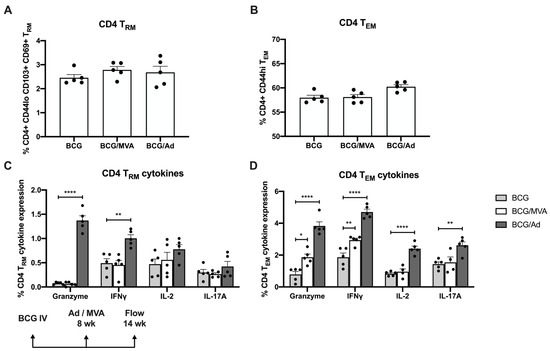 Expression of antimicrobial cytokines by Mtb-specific pulmonary CD4+ memory T cells following BCG/viral vector prime-boost vaccination. CD4+ T cells isolated from the lungs of mice immunized as described in Figure 4 were analyzed by flow cytometry at 6 wk post-boosting for surface expression of (A) resident memory (TRM) and (B) effector memory (TEM) cell markers. ICS was used to evaluate Mtb-specific cytokine expression by (C) CD4 TRM and (D) CD4 TEM cells. Each solid symbol on bar graphs is a data point representative of a single mouse within each group. Data are shown as mean values ± SEM. The significance of differences in cytokine expression between vaccine groups was determined using an unpaired Student’s t-test and are shown as * p < 0.05; ** p < 0.01; **** p < 0.0001.