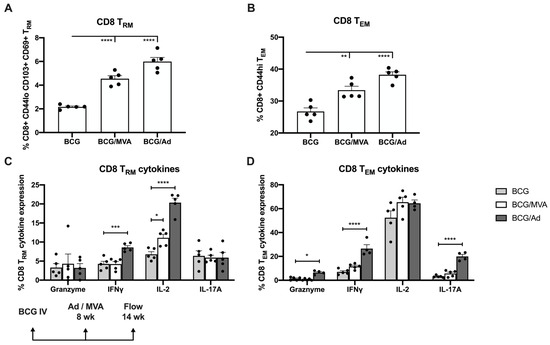 Expression of antimicrobial cytokines by Mtb-specific pulmonary CD8+ memory T cells following BCG/viral vector prime-boost vaccination. CD8+ T cells isolated from the lungs of mice immunized as described in Figure 4, were analyzed by flow cytometry at 6 wk post-boosting for surface expression of (A) resident memory (TRM) and (B) effector memory (TEM) cell markers. ICS was used to evaluate Mtb-specific cytokine expression by (C) CD8 TRM and (D) CD8 TEM cells. Each solid symbol on bar graphs is a data point representative of a single mouse within each group. Data are shown as mean values ± SEM. The significance of differences in cytokine expression between vaccine groups was determined using an unpaired Student’s t-test and are shown as * p < 0.05; ** p < 0.01; *** p < 0.001; **** p < 0.0001.
