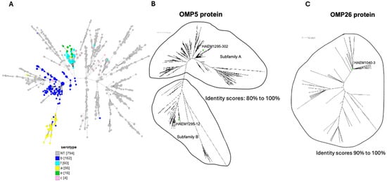 (A) Gene-by-gene GrapeTree software version 10 representation based on core-genome multilocus sequence typing of the 1092 isolates. These genetic relationships were explored using BIGSdb tools available on the PubMLST.org site. The different serotypes and HiNT are indicated with the different colors. The numbers of each serotype or non-typeable isolates are indicated with the numbers in brackets. (B,C) Neighbor-joining tree generated based on the ClustalW alignment of 1121 identified P5 protein and 197 identified P26 protein sequences. CLUSTAL 2.1 Multiple Sequence Alignments (https://www.genome.jp/tools-bin/clustalw accessed on 19 August 2025) was used to align the deduced amino acid (aa) sequences of P5 (247–361 aa, 36 kDa) (B), and P26 (197 aa, 26 kDa) (C) to perform phylogenetic analysis. The distance matrix obtained was analyzed by SplitsTree4. The phylogenetic trees allowed for the selection of three proteins for further analysis (two variants of P5 and one variant of P26), indicated by green circles.