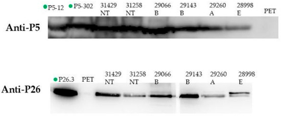 Western blot analysis showing the cross-reactivity of anti-P5 and anti-P26 sera with proteins expressed in different isolates with other P5 and P26 proteins harbored by different isolates of Hi (typeable and non-typeable Hi). The green circles represent the purified proteins P5 and P26 (positive controls). The empty vector (PET) was used as a negative control. NT: non-typeable. B, A, and E stand for H. influenzae of serotypes b (Hib), a (Hia), and e (Hie).
