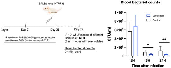 The schedule for active immunization for evaluation of cross-protection of mice with P5 and P26 against different NTHi isolates. Active protection was provided by immunizing mice via the intra-peritoneal route with the purified proteins P5 (12.5 µg/mouse for each protein P5-12 and P5-302) and P26 (25 µg/mouse) or with the buffer as control. The immunization was performed through three doses at day 0, 7, and 21. Mice were challenged via the intra-peritoneal route on day 35 with NTHi isolates expressing different P5 and P26 alleles (109 cfu/mouse) listed in Supplementary Table S3. Each mouse was challenged with one isolate. Bacterial counts in the blood samples of each group were determined at 2, 6, and 24 h after infection by plating on chocolate agar plates. Data are expressed as colony-forming unit per mL (CFU/mL). Results are expressed as mean ± SEM (* p < 0.05, ** p < 0.01 Student’s t-test).