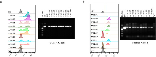 Transfection efficiency of transfectants. FACS and RT-PCR were performed to analyze HLA-A2 expression in COS-7-A2 cells (a) and 586 mel-A2 cells (b). Among all the selected HLA-A2 alleles, the expression of all except HLA-A*02:10 and HLA-A*02:53N were detectable by FACS. Specifically, HLA-A*02:10 and HLA-A*02:53N could not be detected using the FACS antibody; however, RT-PCR results confirmed the successful introduction and expression of these two alleles in the corresponding transfected cells.