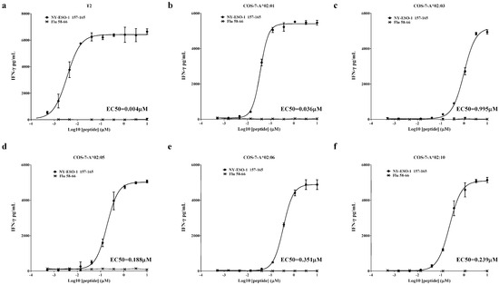 To quantify the functional avidity of TCR-T cells for the five active HLA-A2 alleles (A*02:01, A*02:03, A*02:05, A*02:06, and A*02:10), the antigen peptide (SLLMWITQC) was loaded onto COS-7-A2 and T2 cells in serial dilutions. As shown in Figure 3a–f, TCR-T cells exhibited concentration-dependent recognition of different HLA-A2 alleles. In general, TCR-T cells showed the greatest functional avidity for T2 cells, with an EC50 of 0.004 μM. The functional avidity of COS-7-A*02:01 was lower than that of the T2 cells, with an EC50 of 0.036 μM. The EC50 values of functional avidity for A*02:03, A*02:05, A*02:06, and A*02:10 were 0.995 μM, 0.188 μM, 0.351 μM, and 0.239 μM, respectively.