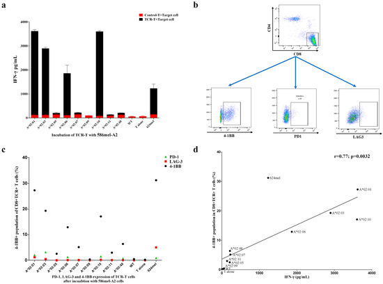 HLA-A*02:01-restricted TCR-T cells could recognize target antigen peptide presented by members of the HLA-A2 supertype in 586 mel cells. (a) IFN-γ secretion results of incubating TCR-T cells and control T cells with 586 mel-A2 cells, 586 mel WT cells, and 624 mel cells. The experiment was performed in triplicate wells, and data are representative of four independent experiments (n = 4). Data are represented as mean ± SD. The difference between TCR-T and Control-T cells was calculated by using multiple t-tests—one per row with GraphPad Prism 6.01 software. (b,c) Detection of activation markers on T cells by FACS. Data are representative of two independent experiments (n = 2). (d) Correlation between IFN-γ secretion and 4-1BB upregulation. The statistical analysis was performed using the Pearson r test of correlation with GraphPad Prism 6.01 software, and p < 0.05 was considered to indicate a statistically significant difference.