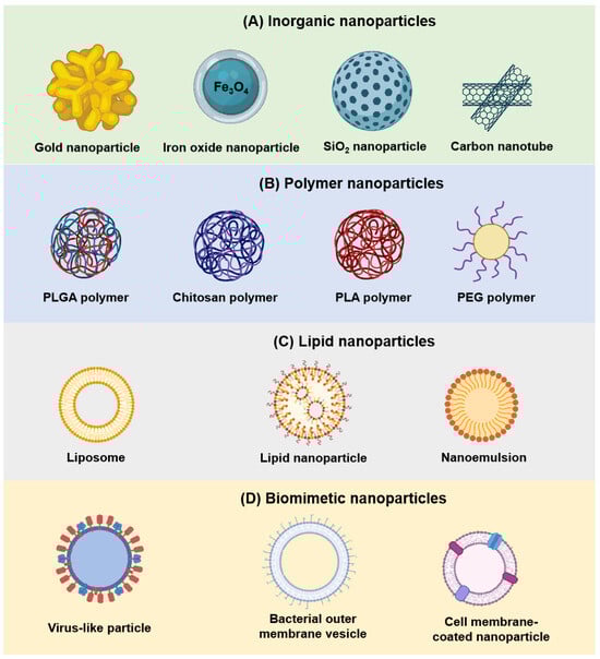 Classes of nanoparticles (NPs) for vaccines. Each class of NP comprises multiple subclasses, with representative examples highlighted herein. (A) Inorganic nanoparticles. (B) Polymeric nanoparticles. (C) Lipid nanoparticles. (D) Biomimetic nanoparticles. Created in https://BioRender.com.