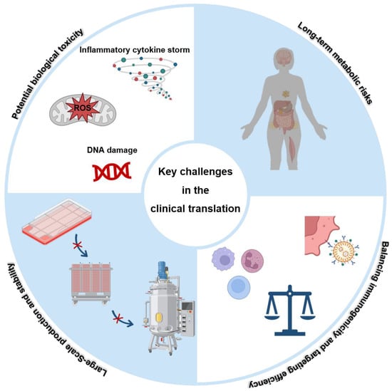 Nanoparticles possess unique physicochemical properties distinct from endogenous biomolecules, complicating their metabolic processing and excretion. Many nanoparticles resist enzymatic degradation and evade clearance via conventional renal or biliary routes, resulting in prolonged in vivo persistence and cumulative toxicity [114,115]. Chronic retention raises concerns of carcinogenicity, reproductive toxicity, and genotoxicity. Al-though data remain limited, nanoparticles may provoke genetic mutations and chromosomal aberrations, and disrupt cell cycle regulation, potentially increasing cancer risk. They may also impair germ cell development and function, compromising reproductive health. To ensure safe clinical application, comprehensive mechanistic studies on nanotoxicity, establishment of standardized safety evaluation protocols, and stringent regulation of nanoparticle manufacture, use, and disposal are imperative.