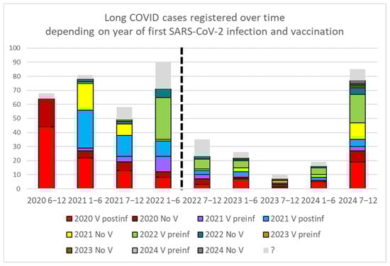 Long COVID cases detected every six months (1–6 indicate the first half of the year, and 7–12 the second half). The year of the first COVID-19 infection is also shown, indicating whether vaccination occurred prior to infection (V preinf), after infection (V postinf), or not at all (No V). The dashed line marks the end of the protocol recommending testing for any symptomatic patient. The increase observed in 2024 coincides with active case finding in the CST via survey. In some long COVID records, the exact date of infection is uncertain, likely due to previous unreported self-diagnosis by the patient. Those cases with uncertain data of infection are indicated as ‘?’.