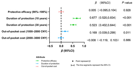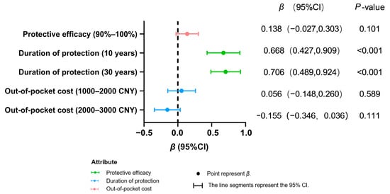 Residents from both rural and urban areas showed no preference for paying 1000–2000 CNY for vaccination (p = 0.345 vs. p = 0.644, respectively). Compared to short-term protection (5 years), both groups exhibited a significant preference for longer protection durations (10 years/30 years; p < 0.001 for both). Regarding enhanced efficacy (90–100% vs. 80–90%), rural residents showed no response (β = −0.010, p = 0.739), while urban residents demonstrated a non-significant positive trend (β = 0.106, p = 0.168) (Table 7). This result is based on calculations using the mixed logit model.