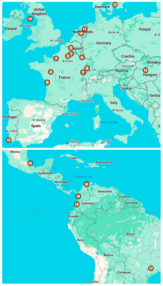 Location of the 20 zoos that participated in Vaxinano’s vaccination campaigns. Europe: (1) Besançon Zoo, (2) Parc d’Isle, (3) Exotic Garden, Foster’s Center for Small Animals, (4) Bioparc of Doué-la-Fontaine, (5) Amnéville Zoo, (6) La Palmyre Zoo, (7) Biotropica Zoo, (8) Zoo and Botanical Garden of Mulhouse, (9) Pairi Daiza Zoo, (10) Apenheul Zoo, (11) Wildlands, (12) Copenhagen Zoo, (13) Curraghs Wildlife Park, (14) Budapest Zoo and Botanical Garden, (15) Lagos Zoo. Central and South America: (16) Africam Safari Zoo, (17) Quinzinho de Barros Zoo, (18) Parque de la Conservacion, (19) Cali Zoo, (20) Baranquilla Zoo.