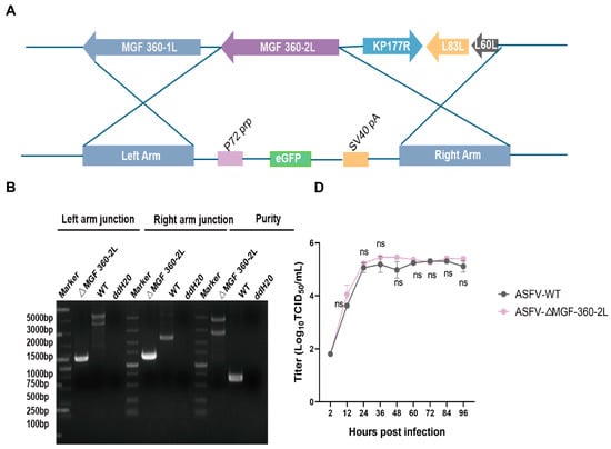 Following infection of PAMs with ASFV CN/GS/2018 and ASFV CN/GS/2018-ΔMGF 360-2L at predetermined time points, the cells along with their culture medium were subjected to repeated freeze–thaw cycles at −80 °C and subsequently diluted. The infected PAMs were then seeded into 96-well plates, and corresponding sample aliquots were added to each well for 10-fold serial dilution. The titration procedure was performed in triplicate. On day 7 post-inoculation, the tissue culture infectious dose 50% (TCID50) was assessed, and the 50% effective infectious dose (TCID50) was calculated using the method described by Reed and Muench. Virus growth kinetics were analyzed and plotted using GraphPad Prism software.
