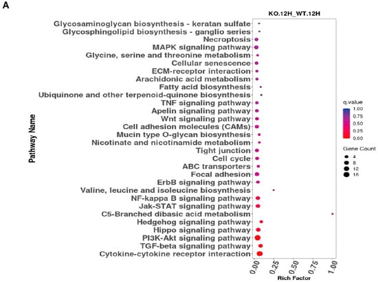 KEGG analysis of ASFV CN/GS/2018-ΔMGF 3 60-2L-infected PAMs through RNA-seq. (A) KEGG analysis of ASFV CN/GS/2018-ΔMGF 360-2L vs. ASFV CN/GS/2018 at 12 hpi. (B) KEGG analysis of ASFV CN/GS/2018-ΔMGF 360-2L vs. ASFV CN/GS/2018 at 24 hpi.