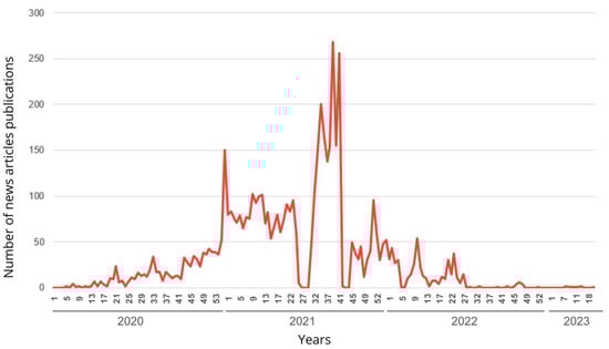 The period chosen for data collection was from 29 December 2019 to 6 May 2023, encompassing the period from the emergence of the first cases of the disease, starting in the first epidemiological week (Epi Week) of the year, until the end of the pandemic as declared by the World Health Organization. The syntax and Boolean operators chosen were “AND vaccine OR coronavirus OR covid”. In SIGCOVID-19, using the syntax and Boolean operators described, a total of 15,231 news articles were identified, categorized by year as follows: 2019—0 articles, 2020—1596 articles, 2021—12,180 articles, 2022—1447 articles, and 2023—8 articles.