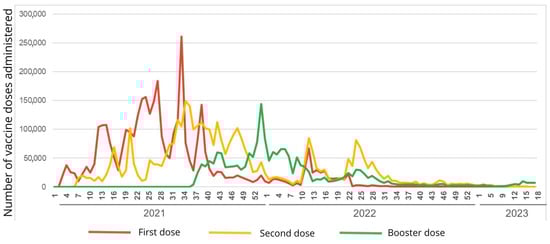 In 2021, a significant vaccination peak occurred, primarily in Epi Weeks 26, 33, and 38, with Epi Week 33 experiencing over 250,000 dose applications. The year contains a gradual increase in the number of vaccinations for the first and second doses. In contrast, the booster dose begins after Epi Week 34, consistent with the start of vaccine application.
