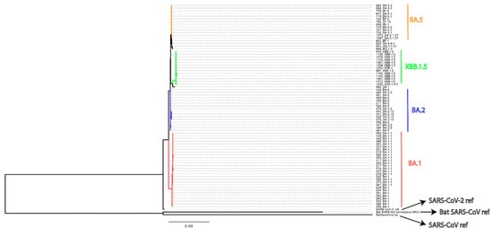 The tree was constructed using IQ-TREE under the HKY+F+I nucleotide substitution model, selected as the best fit, with 1000 ultrafast bootstrap replicates to assess branch support. The analysis included all 75 available sequences. Key SARS-CoV-2 lineages, including BA.1 (referred to here as Omicron), BA.2, BA.5, and XBB.1.5, are annotated. The scale bar represents the number of nucleotide substitutions per site.