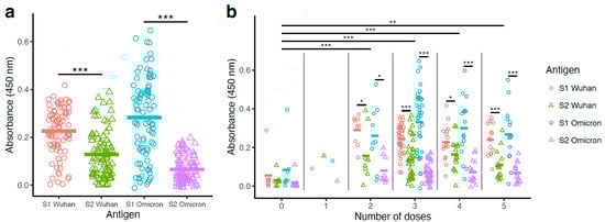 High S1-specific and low S2-specific antibody levels were observed with vaccinated and SARS-CoV-2-infected individuals. Binding antibody levels were measured using serum obtained from 87 study participants. Serum binding antibody titers were measured by ELISA using S1-Wuhan, S2-Wuhan, S1-Omicron, and S2-Omicron as antigens. Antibodies were detected using HRP conjugated secondary anti-human IgG. Absorbance was determined at 450 nm. (a) S1- and S2-specific antibody levels from all participants are shown. Paired t-tests were used to compare antibody absorbance for S1 vs. S2 regions of Wuhan and Omicron antigens. (b) S1- and S2-specific antibody levels from all participants are shown according to the number of vaccine doses. For each dose number, paired t-tests were used to compare antibody absorbance for S1 vs. S2 regions of Wuhan and Omicron antigens. Means for each number of doses were compared using a linear mixed model with individual patient identification as a random effect. Statistical significance was defined as * p < 0.05, ** p < 0.01, and *** p < 0.001.