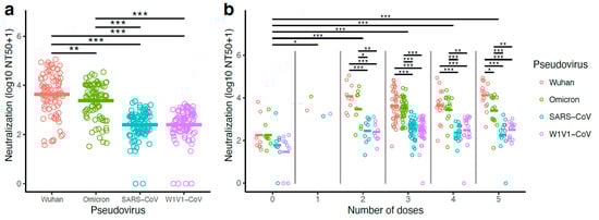 Highest antibody neutralization concentrations were observed against Wuhan and Omicron pseudoviruses. Neutralizing antibody levels were measured using serum obtained from 87 study participants. Neutralization concentrations were reported as a 50% neutralization titer (NT50). Values were transformed due to a skew in the data (log10 of NT50+1 transformation). (a) Neutralization titers for Wuhan, Omicron, and SARS-CoV and WIV1-CoV pseudoviruses are shown. Titer means of pseudoviruses were compared using a linear mixed model with individual patient identification as a random effect. (b) Neutralization titers analyzed according to the number of vaccine doses are shown. Similar linear mixed models were used to compare values within and among the number of doses. Statistical significance was defined as * p < 0.05, ** p < 0.01, and *** p < 0.001.